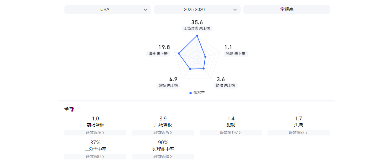 贺希宁本赛季的状态确实火热,而且这份火热绝非灵光一闪,而是贯穿整个赛季的稳定输出。
